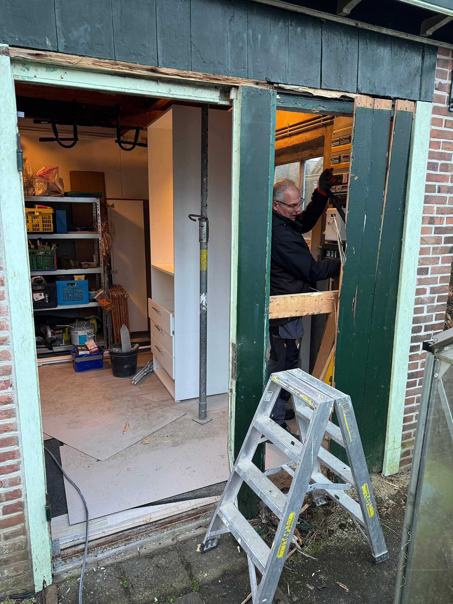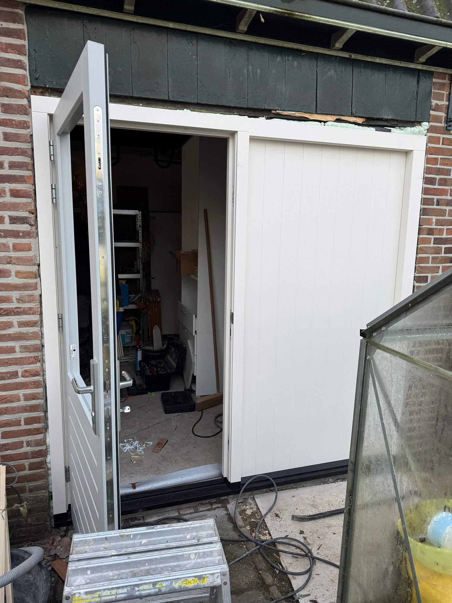 Het oude houten kozijn en de deuren zijn zorgvuldig verwijderd. Vervolgens is de opening gecontroleerd en waar nodig constructief aangepast. Hierbij is rekening gehouden met de bestaande elektra en indeling van de schuur, zodat alles netjes behouden bleef.