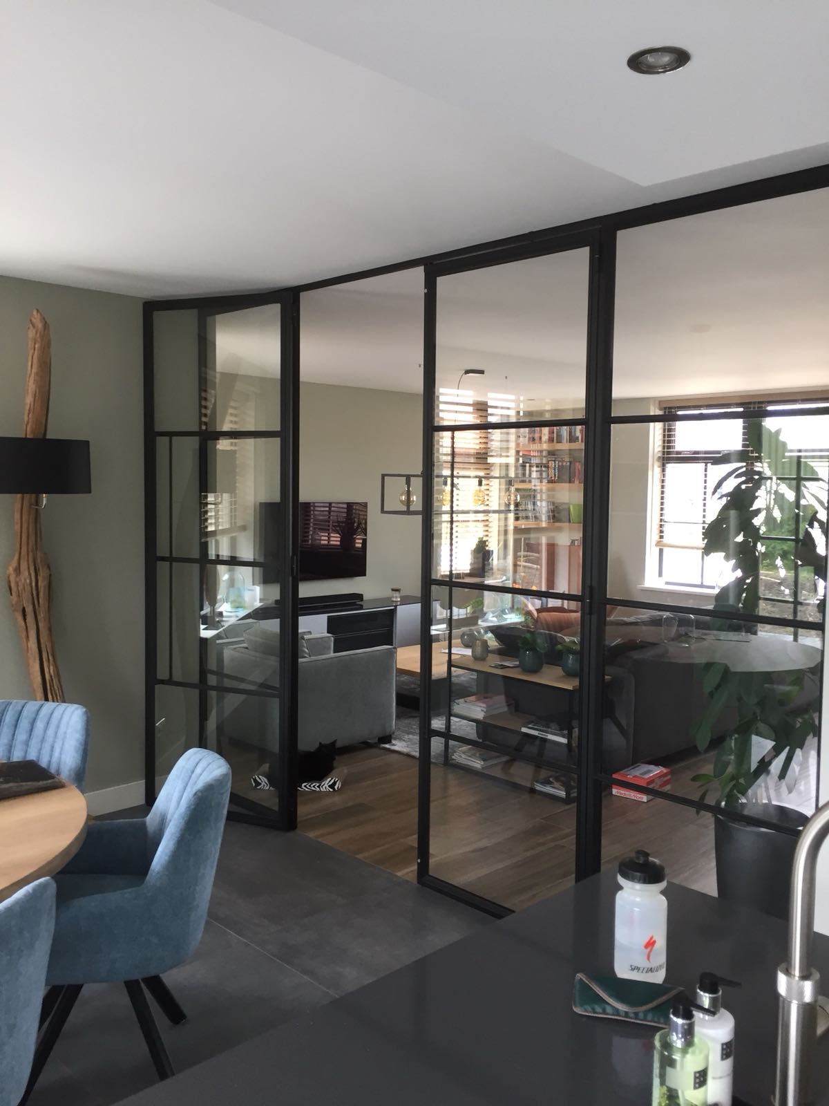 - Stalen schuifdeuren: ruimtebesparend en stijlvol. Perfect voor kleinere ruimtes of als flexibele wand tussen keuken en kamer.